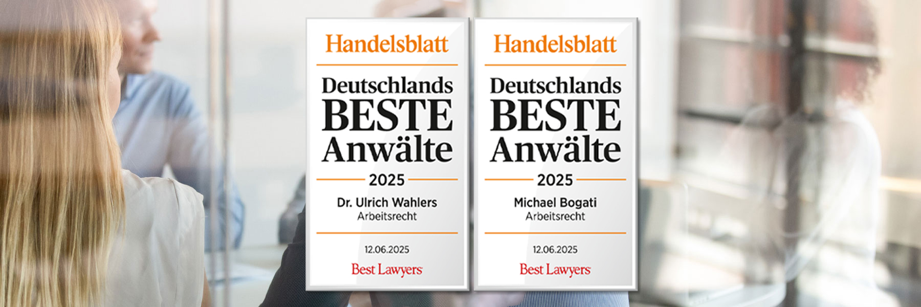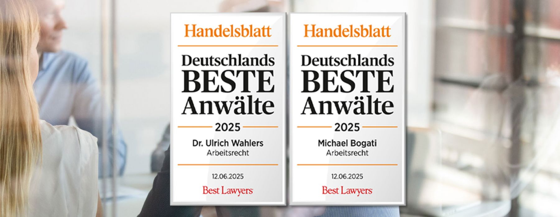 In cooperation with the US publishing house Best Lawyers, Handelsblatt has once again included Michael Bogati and now Dr. Ulrich Wahlers as well in the list of Germany’s best lawyers in labour law.